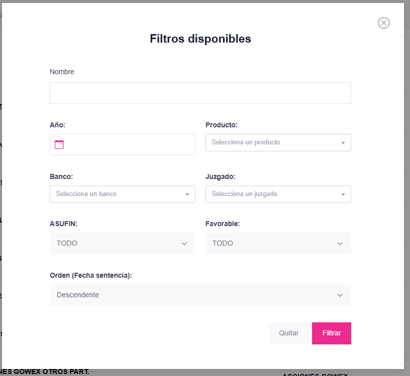 Si el socio conoce el juzgado, se podrá filtrar, si este coincide con alguna instancia. Siempre mostrará el procedimiento al completo.