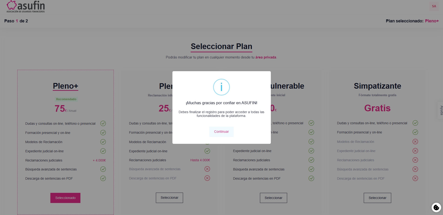 El socio tendrá que seleccionar el plan y darle al botón "Continuar"